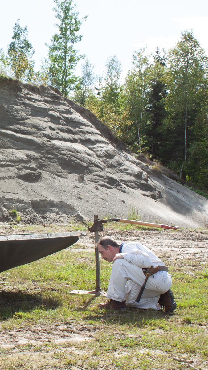 Dans le fond, je ne viens pas du milieu du théâtre, ce qui toutefois ne m’empêche pas d’avoir un penchant pour ce qu’on appelle la convention théâtrale. Mes sculptures de cette époque étaient justement le plus souvent des machines de facture un peu Léonardesques dédiées à des missions supérieures (engins volants, machines à pardonner …) et tablant pour ce faire sur une complicité tacite des gens. Or justement, cet accessoire de scène suggérant le creusage d’un terrain s’est retrouvé comme les autres au rancart dans une grange, pendant plus de dix ans.