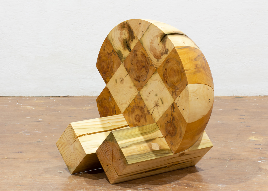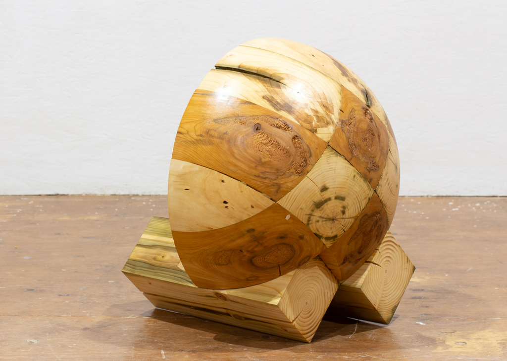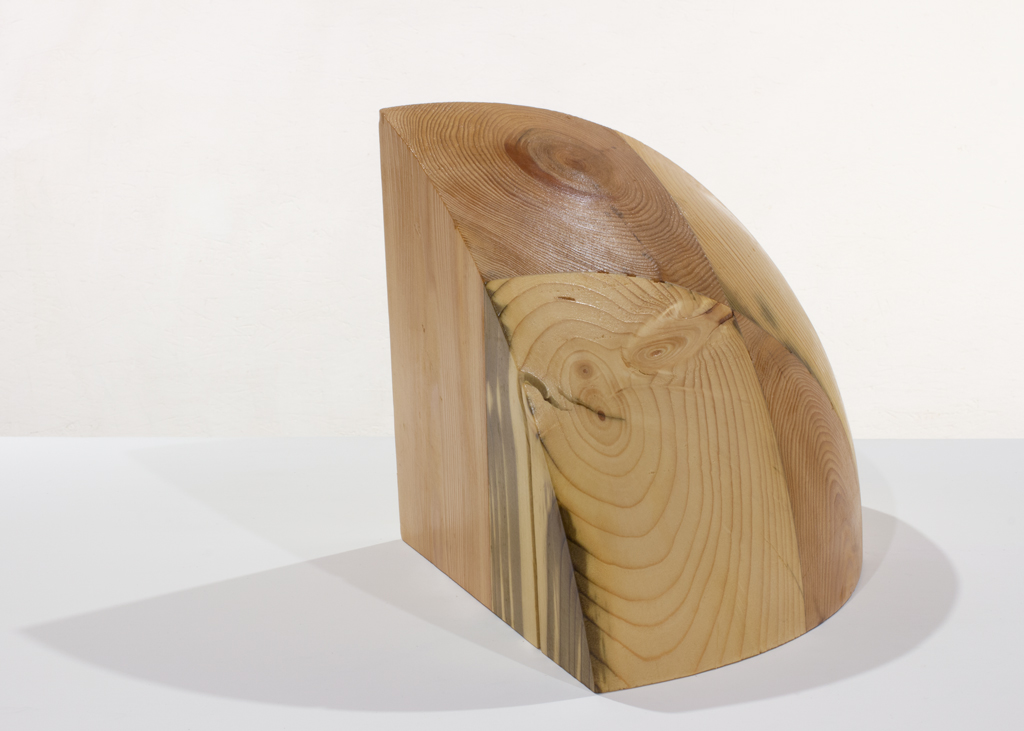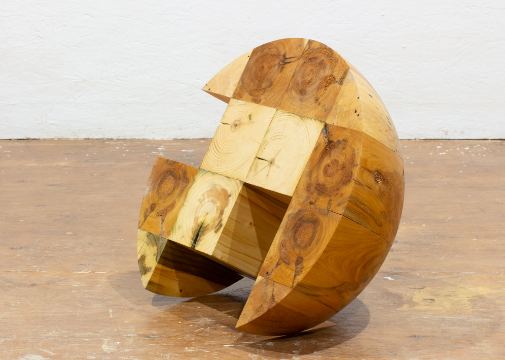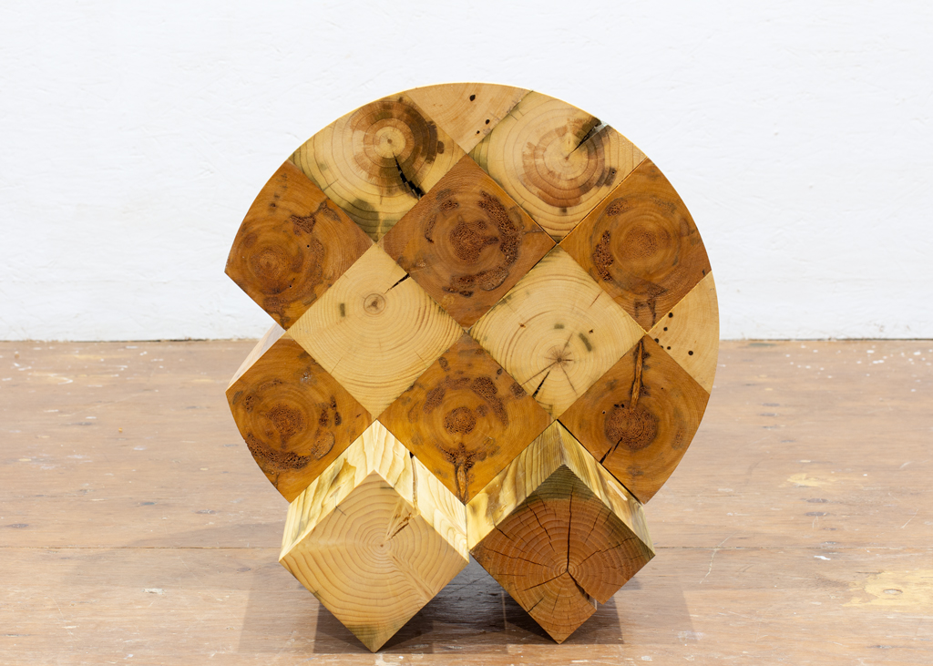 C’est ensuite par commodité que j’ai approché cette série que je voulais faite de volumes pleins. Des pièces de cèdre local que j’avais déjà en bonne quantité puis d’autres de bois traité de profil semblable et très faciles à trouver. Une fois rectifiées, les unités carrées de 5 x 5 pouces se prêtaient bien au projet. En alternant les essences dans les collages, parfois de façon systématique et parfois pas, j’en disais assez pour mettre l’accent sur ce qui peut se produire lorsque les sphères sont taillées dans des masses faites de quatre rangs de ces pièces carrées de 5 x 5 pouces, soit seize au total. Très simplement, l’on peut lire le déploiement de ces pièces droites qui une fois sculptées, font apparaître le damier en une version arrondie. Sur les surfaces, apparaissent des losanges portant systématiquement la même distorsion puis des arcs rectangulaires et enfin des formes d’ogive toutes pareilles. J’avais là des éléments archétipaux, si l’on veut. Toujours les mêmes que j’allais essayer de convoquer dans de futures expériences.
