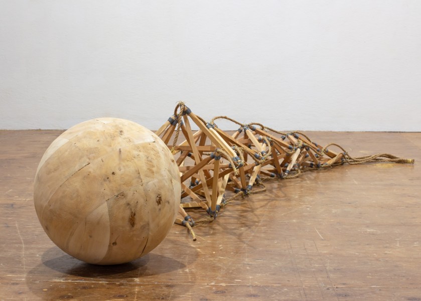 Ce qui arrive étude 1 Ce qui arrive étude 1 2020 Bois (cèdre local, érable, hêtre), acier galvanisé, câble de sisal, cordon de polyesterSphère, diam 51 cm. L’ensemble : 51 x 280 x 78 cm. Articles similaires