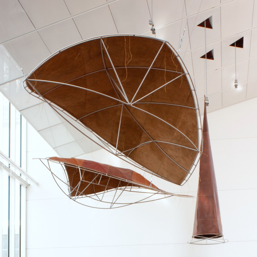 Qu’il s’agisse aussi bien d’éléments du paysage que de réalisations humaines, ce qui se donne à voir de ce territoire en évolution est le fruit d’un travail incessant sur les formes. En conséquence, les figures sont faites d’une matière façonnée par contrainte. Le cuir tendu doit sa forme à des poussées et des tractions qui s’élancent jusqu’au plafond. Les formes ne peuvent même se déployer qu’en raison de leur poids, ce qui leur confère une plus grande pertinence en regard du mode de présentation choisi, soit la suspension.