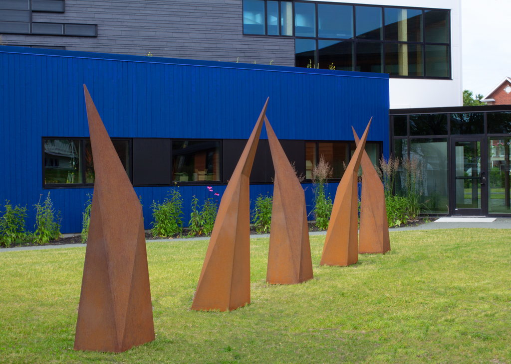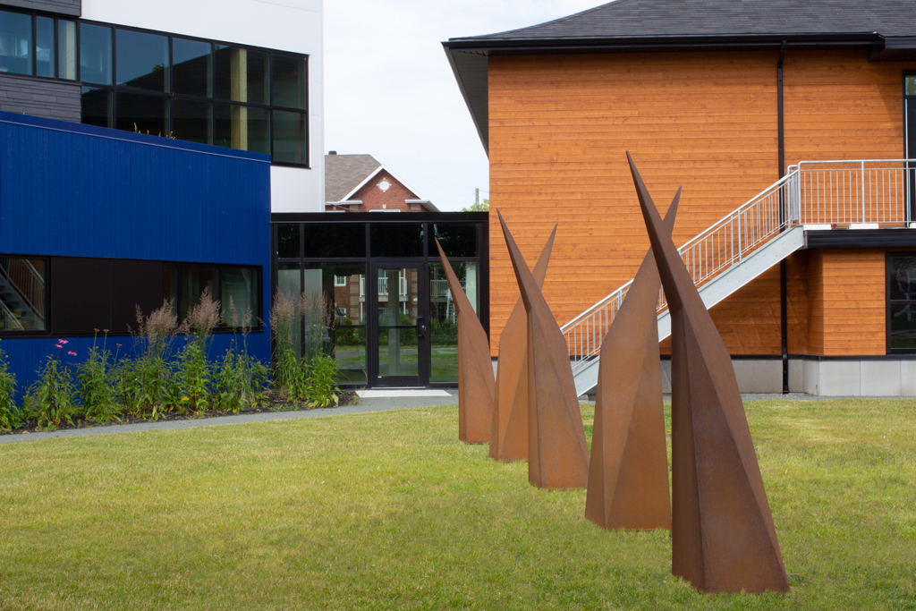 À l’école de charpenterie et menuiserie, alignée exactement vers l’entrée de la passerelle, s’ouvre aussi une percée visuelle au travers des cinq pointes de coloration semblable, vues en raccourci. En circulant autour, l’ensemble va se distendre pour laisser apparaître chaque unité puis les pointes se mélangent encore en un trait pour trancher la cour en deux.