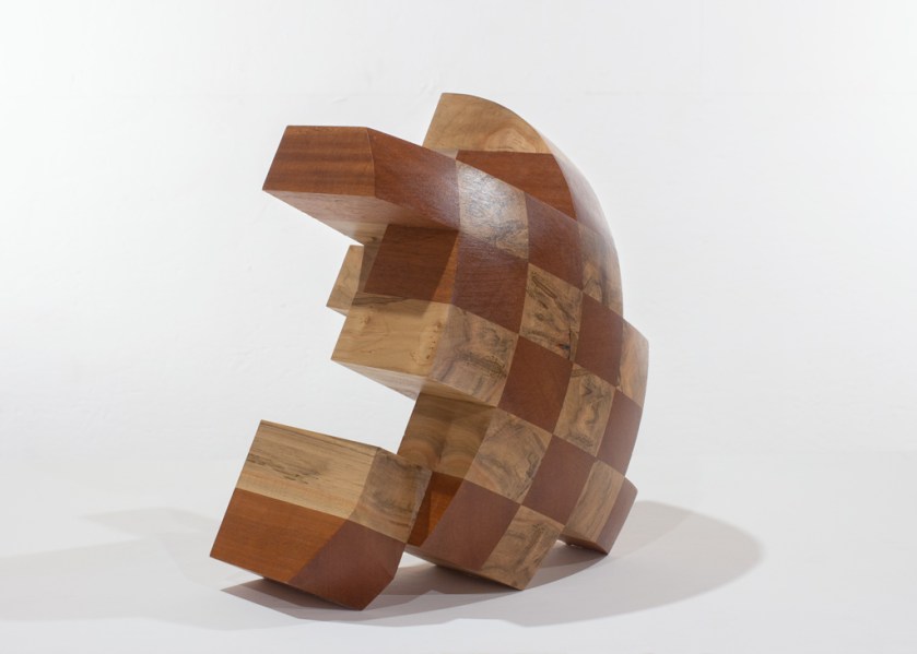Je m’émerveille encore de toute la complexité qui se dégage d’une simple sphère en chantier, soit avant qu’elle n’atteigne un rendu bien plus minimal. Dans l’intervalle, elle se voit traversée par des axes bien droits qui parfois correspondent à son diamètre mais pas toujours. Souvent aussi, l’on y décèle une notion de cubage par le biais de trames formées par des collages de bois aux profils carrés. En bref, cette série d’objets met en scène les lignes droites, en relation avec la forme sphérique qu’on les charge d’incarner.