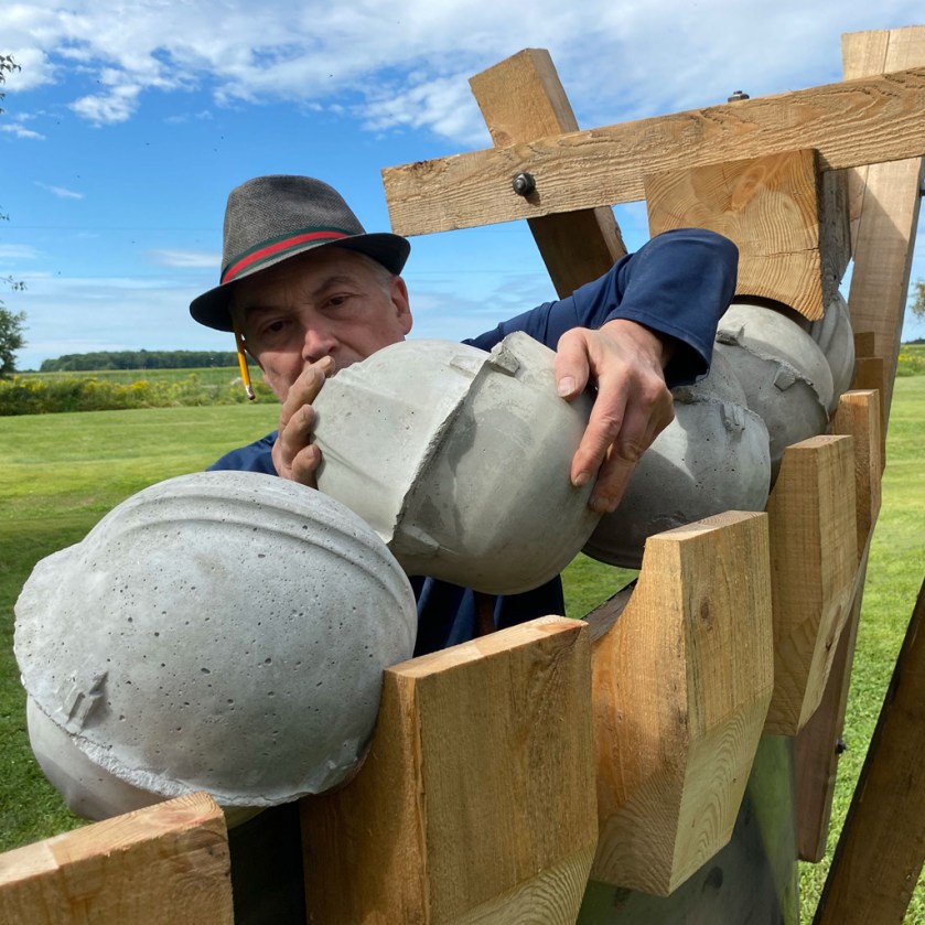 Même une sculpture éphémère peut avoir plusieurs vies, de par sa matière, sinon par son énergie. Quelques casques supplémentaires se sont bien avérés nécessaires mais je ne manque jamais de béton pour y remédier. En outre, et comme si les noyers noirs des alentours l’y incitaient, la nouvelle pièce s’est articulée devant eux, de manière somme toute assez semblable, suivant un arc ascendant.