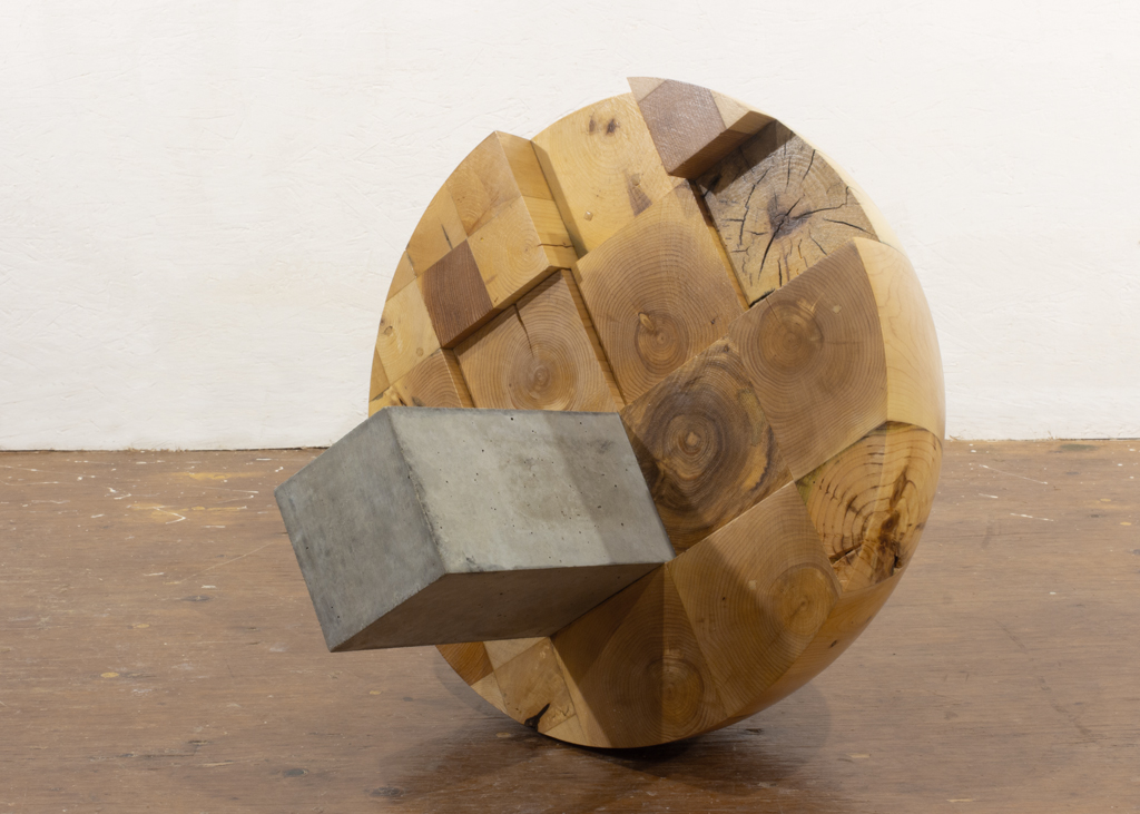 La chose la plus importante est cependant la masse volumique du béton qui, étant bien supérieure à celle du bois, entre en jeu pour troubler l’équilibre visuel en affectant le balan des pièces. Parfois, la masse de béton est un facteur de basculement et de mouvement et parfois, au contraire, de stabilité. Là s’explique le double-sens du titre qui, dans le fond, n’évoque pas de savants calculs sur les leviers et la distribution de la masse mais l’expérience empirique. Le système de validation du travail de sculpture est encore d’ordre esthétique mais se joue également sur des bases inédites, très concrètes.