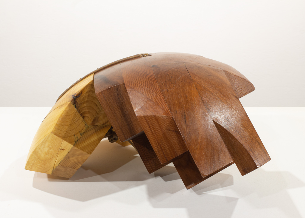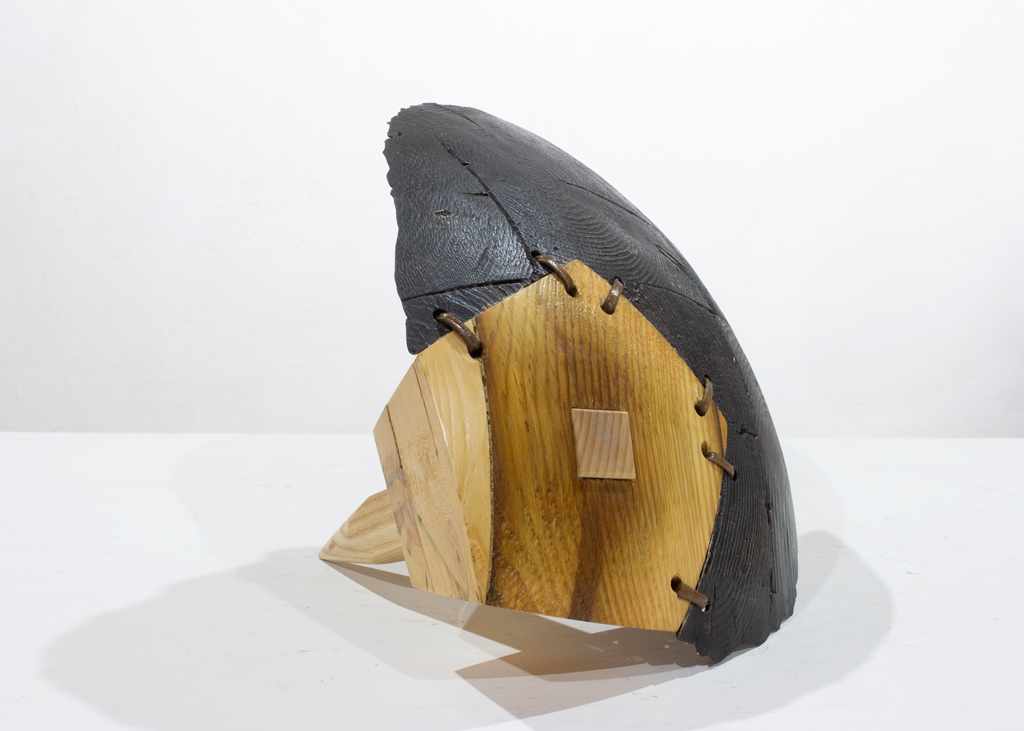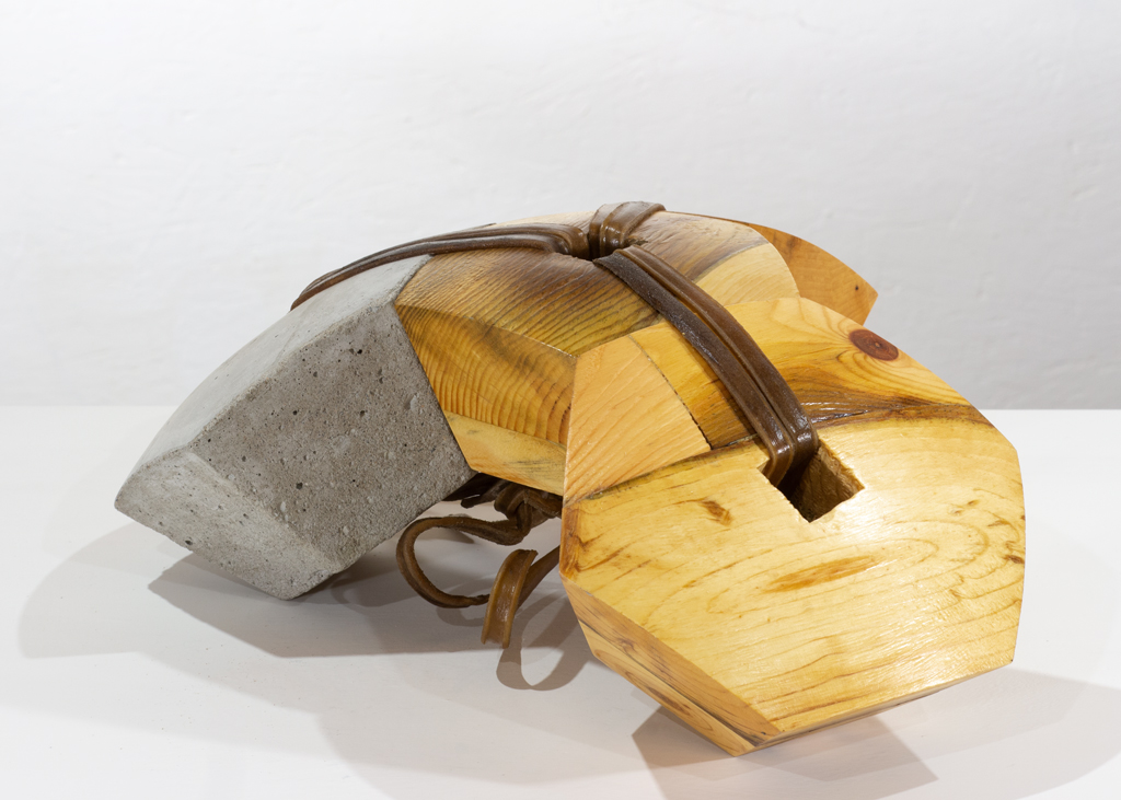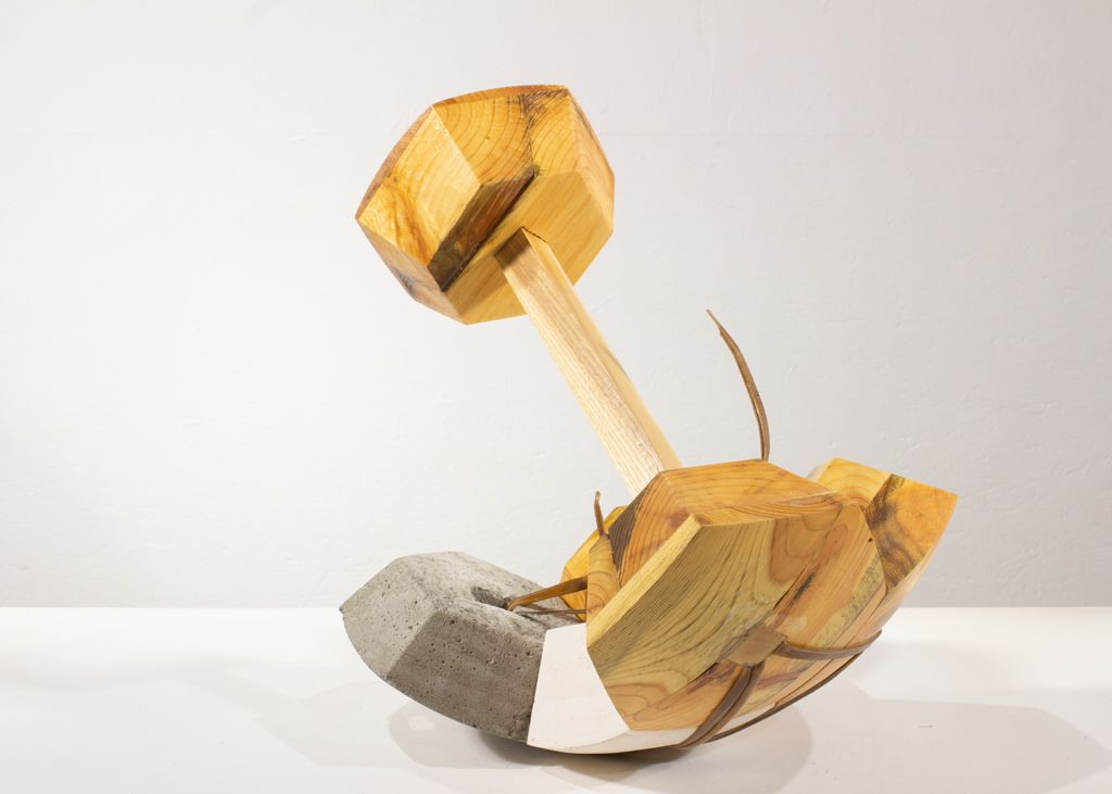Qu’un matériau soit choisi, pour sa pertinence ou à contremploi, s’opère déjà une suite de conséquences sur le plan de l’exécution, de l’aspect général, sans compter le centre de gravité. En effet, une forme aussi dynamique qui par ailleurs a longtemps conduit à coudre des ballons, rend tout de suite compte des disparités de masses entre ses surfaces ; de par sa position, il aura tôt fait de résoudre l’équation de tout ce qui le constitue.