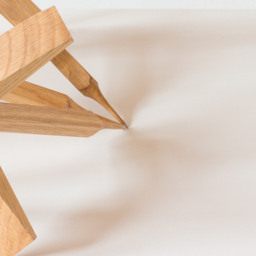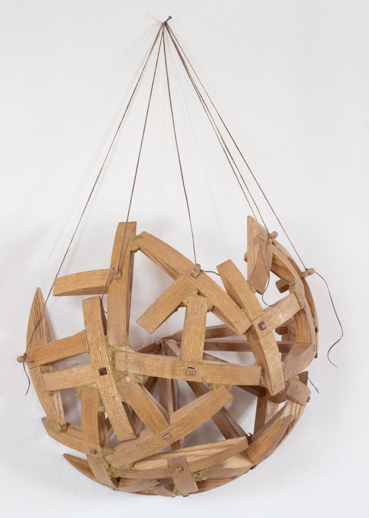 Que faire des grands classiques des cours à bois que sont les six par six de bois traité : un dans un sens, puis un autre le traversant à mi-bois, puis un troisième, un quatrième et ainsi de suite en périphérie, tournoyant autour d’axes faits de quatre par quatre, tous attirés vers un ultime point de référence. Nous avions là des structures de dômes à peine esquissées mais solidaires d’un même rayon, un vocabulaire de charpenterie célébrant la courbe à force de segments droits. Or, et dès le début du processus, j’ai exproprié une partie de l’atelier pour y créer un autre espace de travail à hauteur des hanches. Depuis lors, je peux en tout temps aller m’agiter dans une cour à bois alternative, peuplée des mêmes pièces massives, mais réduites à l’échelle de 1 pour 5, soit cinq fois plus petite que celle des spécimens de cours à bois.
