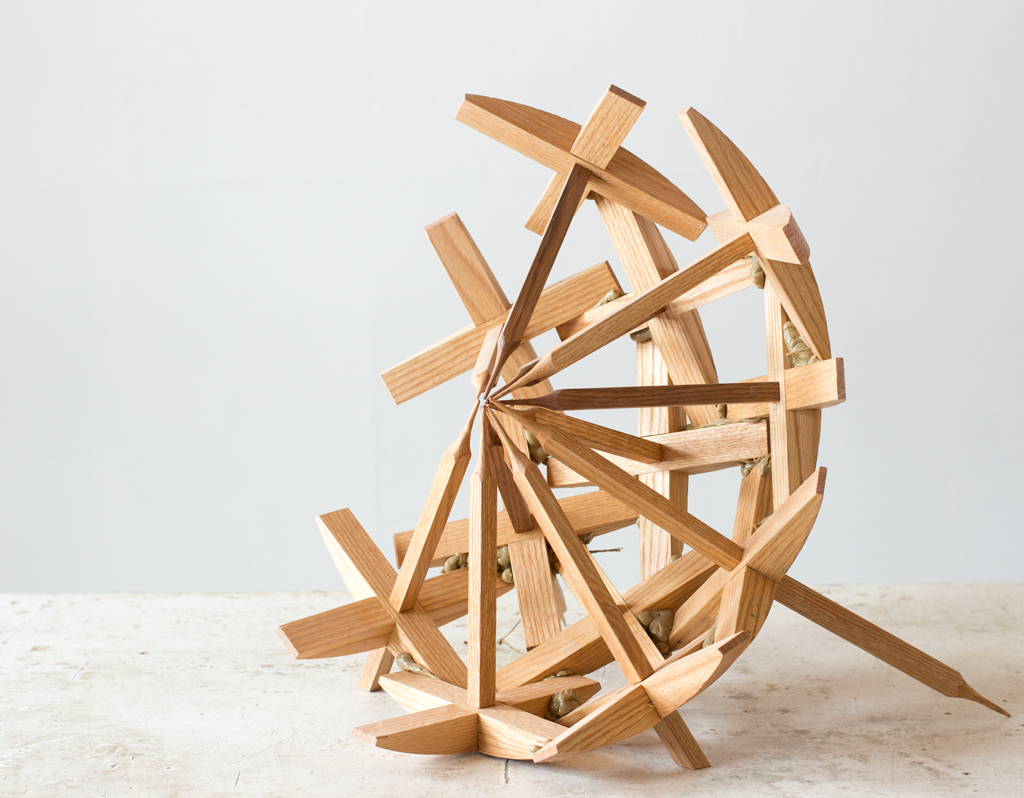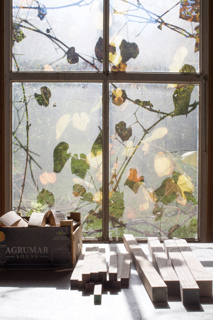 Souvent, il me revient en tête que la création des monnaies s’accompagne d’une contrepartie en or, question d’asseoir une forte confiance envers la devise qu’on est en train d’instituer dans le monde et qu’on souhaite voir circuler de mains en mains. Ultimement, cette nouvelle monnaie servira même en retour à suivre quotidiennement les fluctuations de l’or sur les marchés. Il se pourrait bien que ce soit justement ces grosses beams standardisées et beurrées de créosote, fort peu transcendantes et si faciles à trouver partout qui m’aient permis de statuer, à mon tour, que les petites baguettes de profil carré que je venais de produire pour l’avenir ne sont pas une lubie. Ce ne sera pas en vain que j’aurai déligné un stock de chêne rouge en petites unités soigneusement mesurées. Je ne manipulerai plus seulement de gros morceaux un à un à bras raccourcis contre le seul abdomen que j’ai, mais aussi les petits, les faisant gracieusement tourner de mes dix doigts ; voilà l’échelle un pour cinq. Endossée en haut lieu dans toutes les succursales pour bricoleurs, une nouvelle norme d’échelle réduite n’aurait désormais rien de si loufoque, même pour moi qui traîne encore la réputation de ne construire que de très grandes sculptures qui ne passent pas les cadres de porte. Ainsi, m’appuyant sur les standards des chantiers de construction et d’aménagement paysager, je crois m’être sorti du vertige lié au brusque changement d’échelle. Toujours est-il que lors de la préparation de l’exposition Travaux armillaires à Québec en 2016, j’ai alterné de l’échelle 1 pour 1 côté cour à bois à l’échelle 1 pour 5, côté jardin. J’ai trouvé mes aises dans l’un et l’autre espace, au point de ne plus percevoir désormais les petites choses comme des maquettes. Ce ne sont pas des maquettes se limitant à représenter quelque chose qui existerait ailleurs. Au contraire, ce sont des compagnons de route au quotidien, des idées installées dans le concret. Les maisons de poupées sont habitables, pour peu qu’on y entre au lieu de s’asseoir devant.