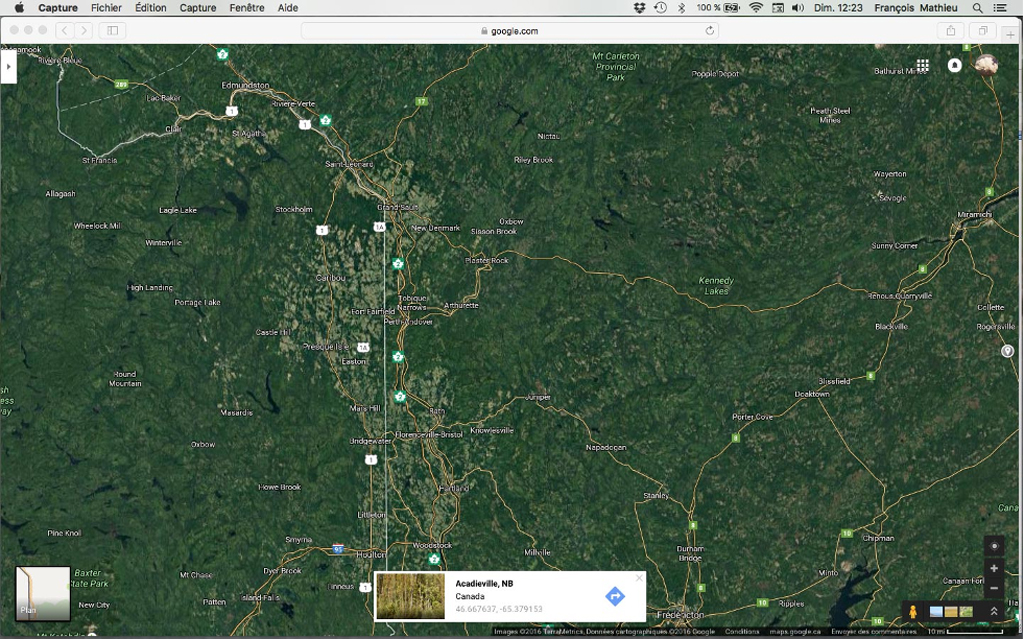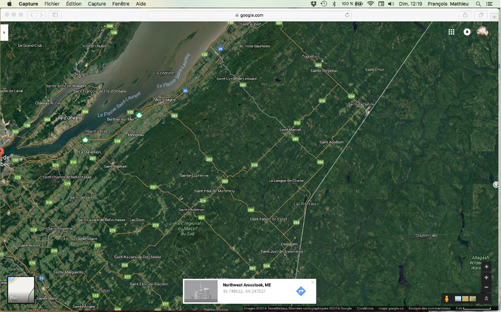 Pour la suite des choses, c’est le cadre et l’envergure des cartes qui m’intéresse. Une recherche Google sous Quebec city m’a rendue la ville dans un cadre générique, une échelle aléatoire s’étendant sur environ 187 kms à l’horizontale. L’idée de voyager par l’image m’a ensuite imposé de tasser le centre-ville complètement à gauche de la carte afin de voir quelle escale m’attendait à l’autre bout de l’élastique, soit 187 kms plus loin. L’ultime pixel de cette carte était Northwest Aroostook. C’est de là que j’allais repartir pour la prochaine escale.