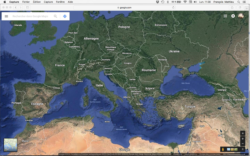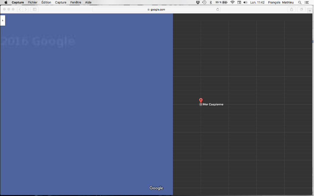Je me suis bien rendu compte qu’il aurait été fastidieux de coller des cartes à peine longues de 187 kms pour en faire un long panoramique jusqu’en France. J’ai alors pris la décision de dé zoomer d’un clic chaque nouvelle carte pour les rendre exponentiellement plus grandes à chaque fois. Les distances furent avalées toujours plus vite à chaque fois. Or, ce qui devait arriver arriva ; je suis passé tout droit pour me retrouver au large du Kazakhstan.