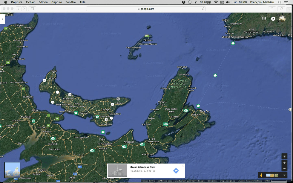 L’entreprise prend de l’expansion, tellement même qu’il nous faut passer d’un trait par dessus l’Île du Prince-Edouard et le Cap Breton. Et nous voilà en mer.
