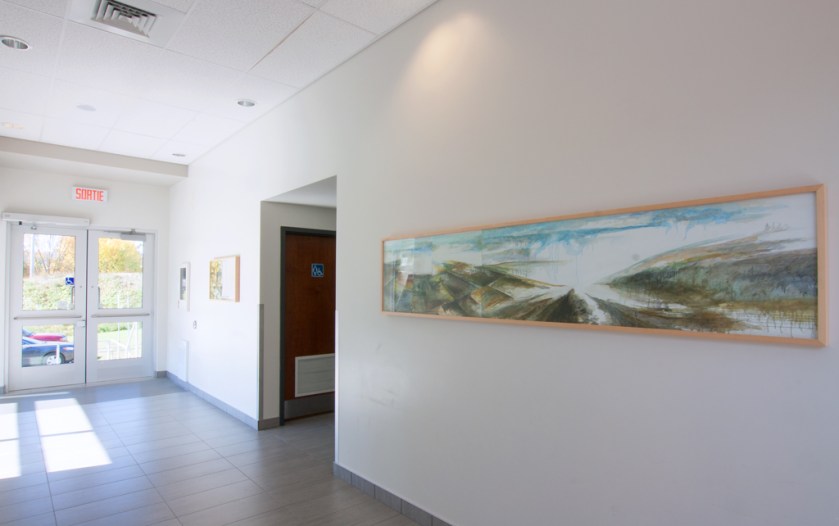 Les travaux préparatoires sur la maquette m’ont dissuadé d’y installer une œuvre en relief, même de peu d’épaisseur. Cet espace étant essentiellement un lieu de circulation, une œuvre dite intégrée à l’architecture ne saurait y représenter une entrave pour les gens. Cela étant, l’endroit pressenti m’a semblé appeler tout naturellement une peinture. Une peinture protégée de surcroit, par un verre trempé.